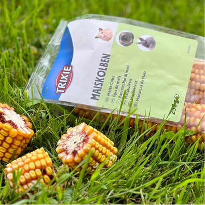 Maiskolben am Stück oder vorgeschnitten. Enthalten gesunde Mineralstoffe wie Kalium, Magnesium, Folsäure sowie Beta-Carotin. Dient vorallem als Beschäftigung, da die Körner abgenagt werden müssen.
