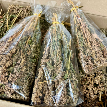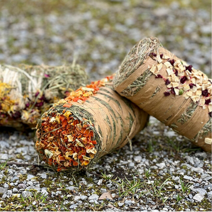 Mit Naturfasern gebundener Heuballen in drei verschiedenen Geschmacksrichtungen: Blüemli-Mix mit Ringelblumen und Rosenblättern; Rot-Weiss mit roter Beete und Pastinaken; Halloween mit Rüebli und Kürbis.