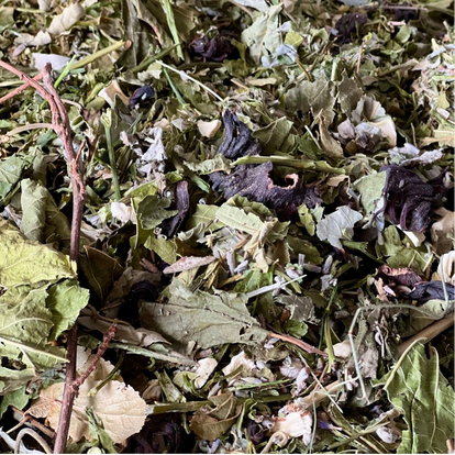Inhalt: Apfel-/Kirsch-/Johannisbeer- und Maulbeerblätter, Ringelblumen, Rosenblüten, Apfelstücke, Weichholzspäne