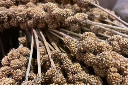 Mix aus verschiedenen Getreideähren wie Silberhirse, Sorghum, Flachsähren, Hafer- und Weizenähren