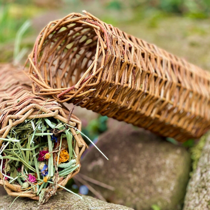 Grosser Weidentunnel leer oder gefüllt mit gesundem Timothyheu, Zinnkraut, Löwenzahn, Ringelblumen, Arnikablüten, roten und blauen Kornblumen