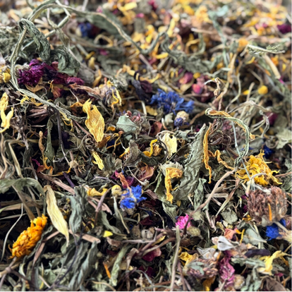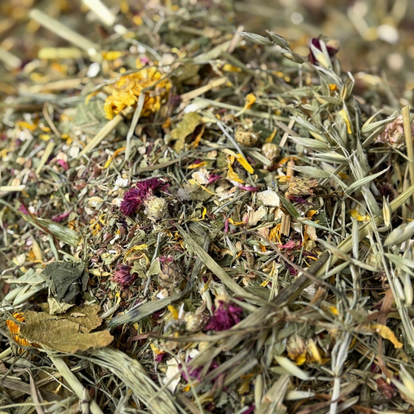 Blütenmix mit ergänzenden nahrhaften Blättern (viele Spurenelemente, Mineralstoffe und Proteine). Ideal als Zusatz zur normalen Heugabe, veredelt die gewöhnliche Heufütterung. Für diverse Nagetiere, aber auch pflanzenfressende Exoten wie Echsen und Schildkröten geeignet.